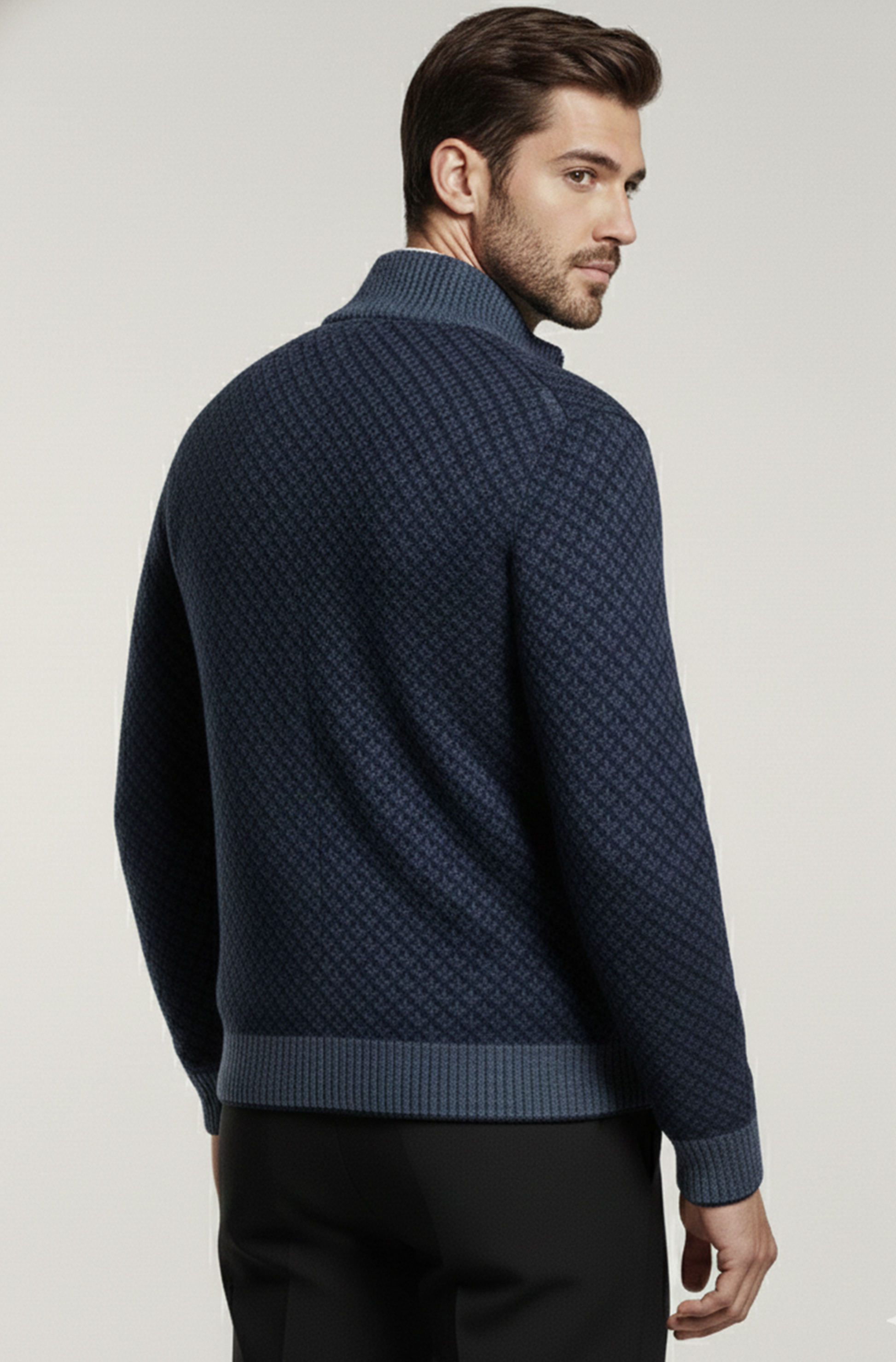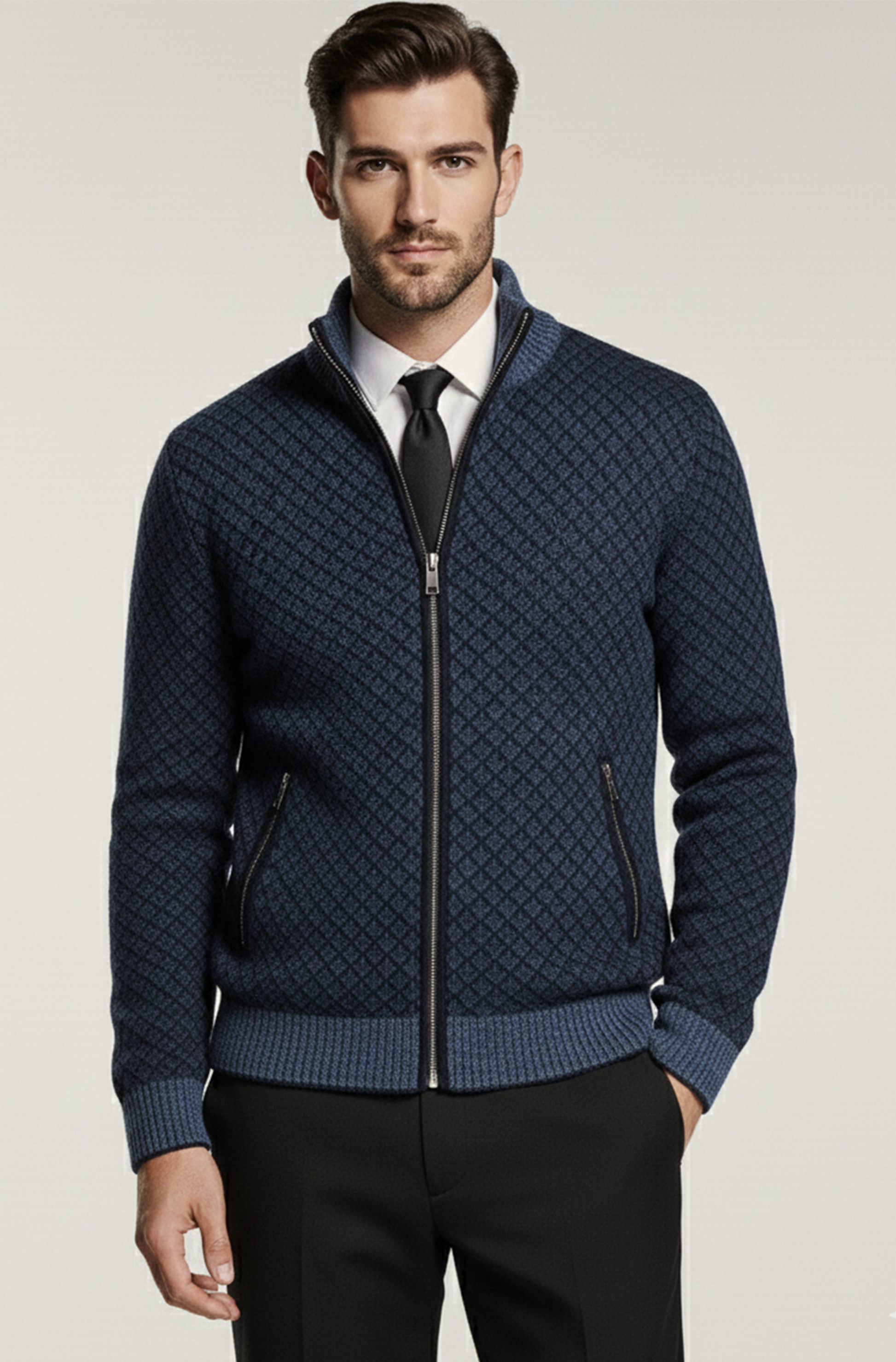 Stickad Jacka med Hög Krage och Geometriskt Mönster | Henrik – Marinblå