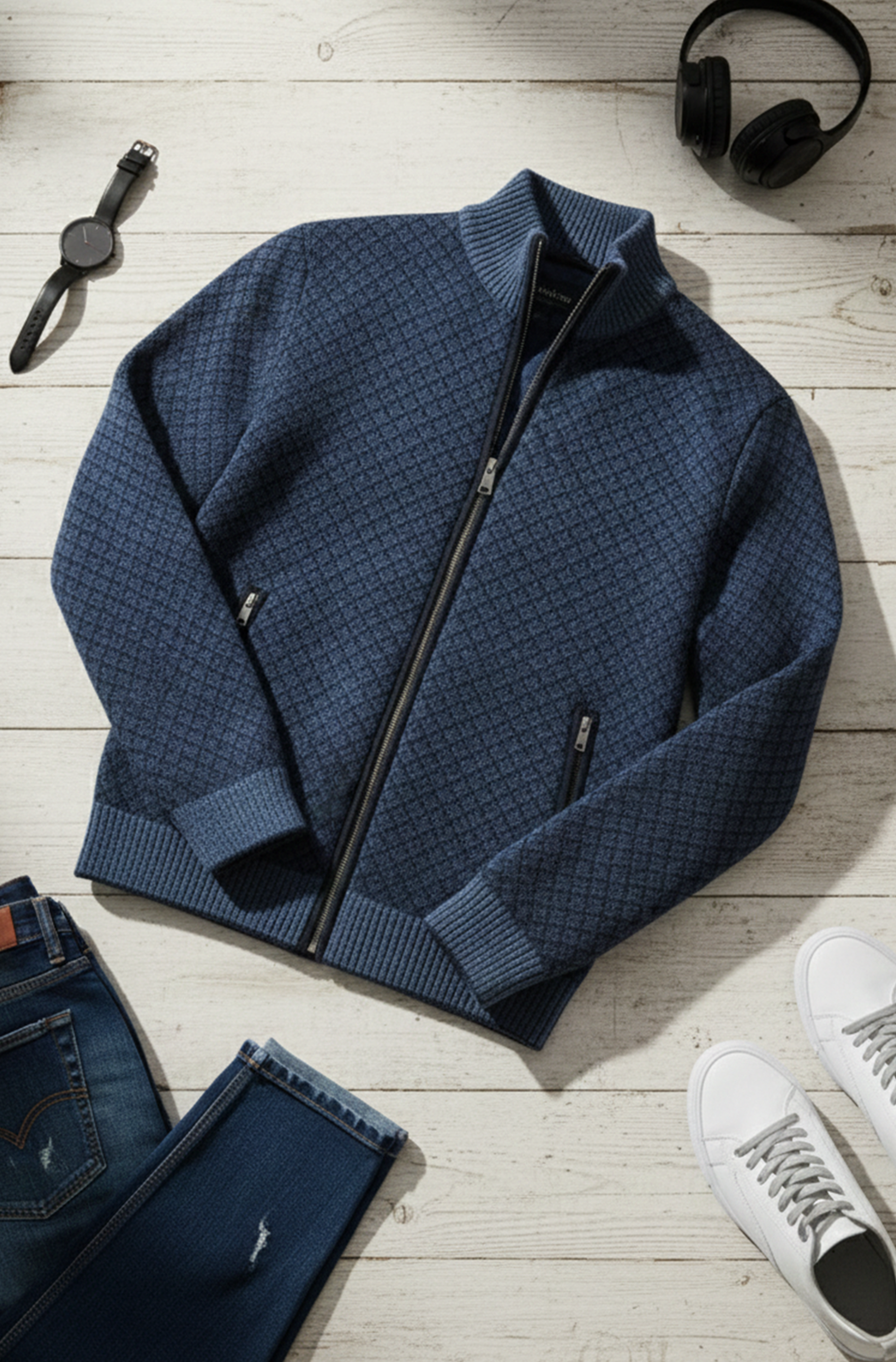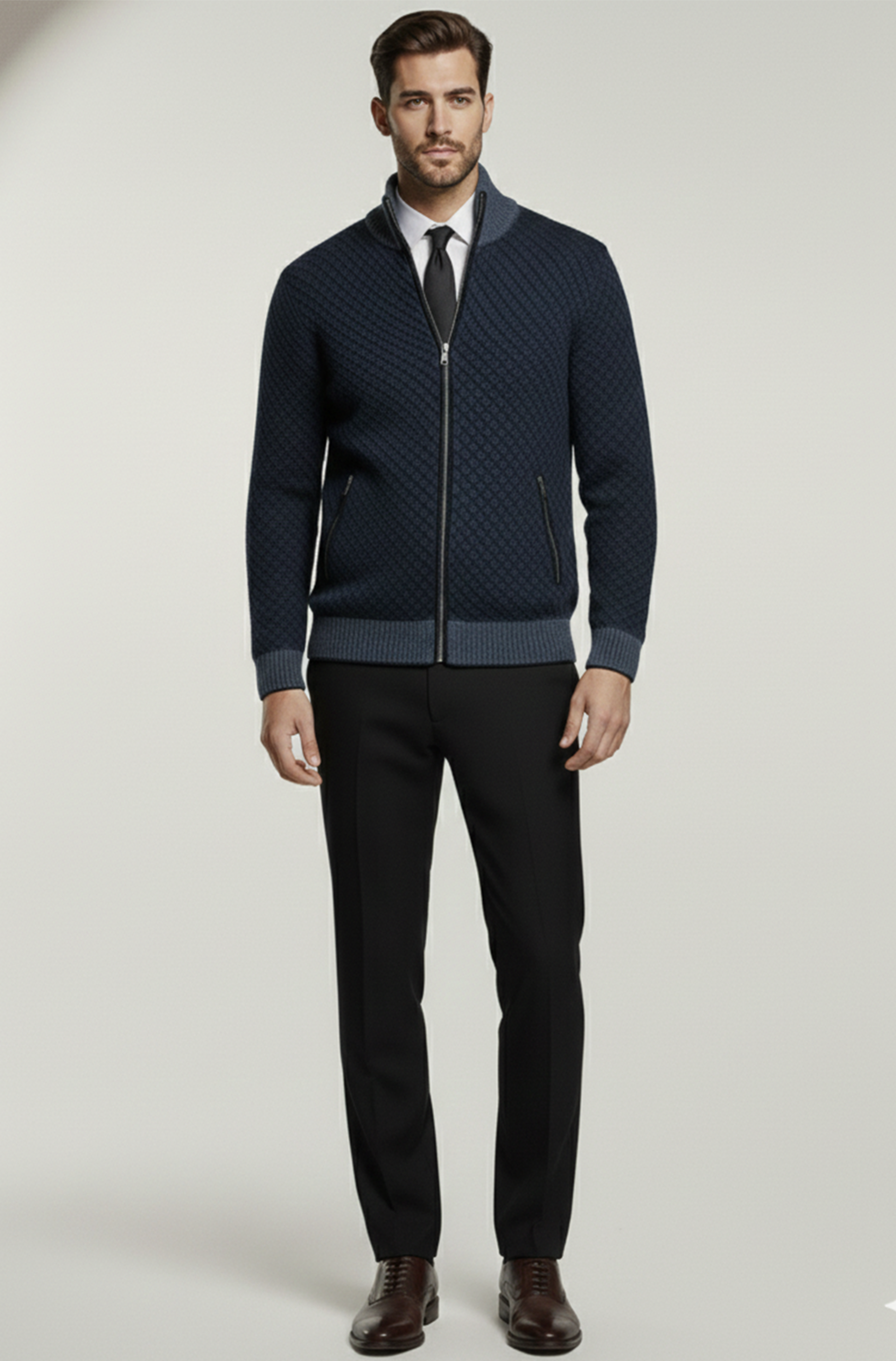 En klassisk och tidlös stickad jacka i en djup marinblå ton som förmedlar både elegans och enkelhet. Det subtila geometriska diamantmönstret ger jackan ett exklusivt uttryck, medan den höga kragen och dragkedjan i full längd gör den både funktionell och bekväm. “Henrik” i marinblått är ett perfekt val för dig som vill ha en mångsidig och sofistikerad färg som passar alla säsonger.