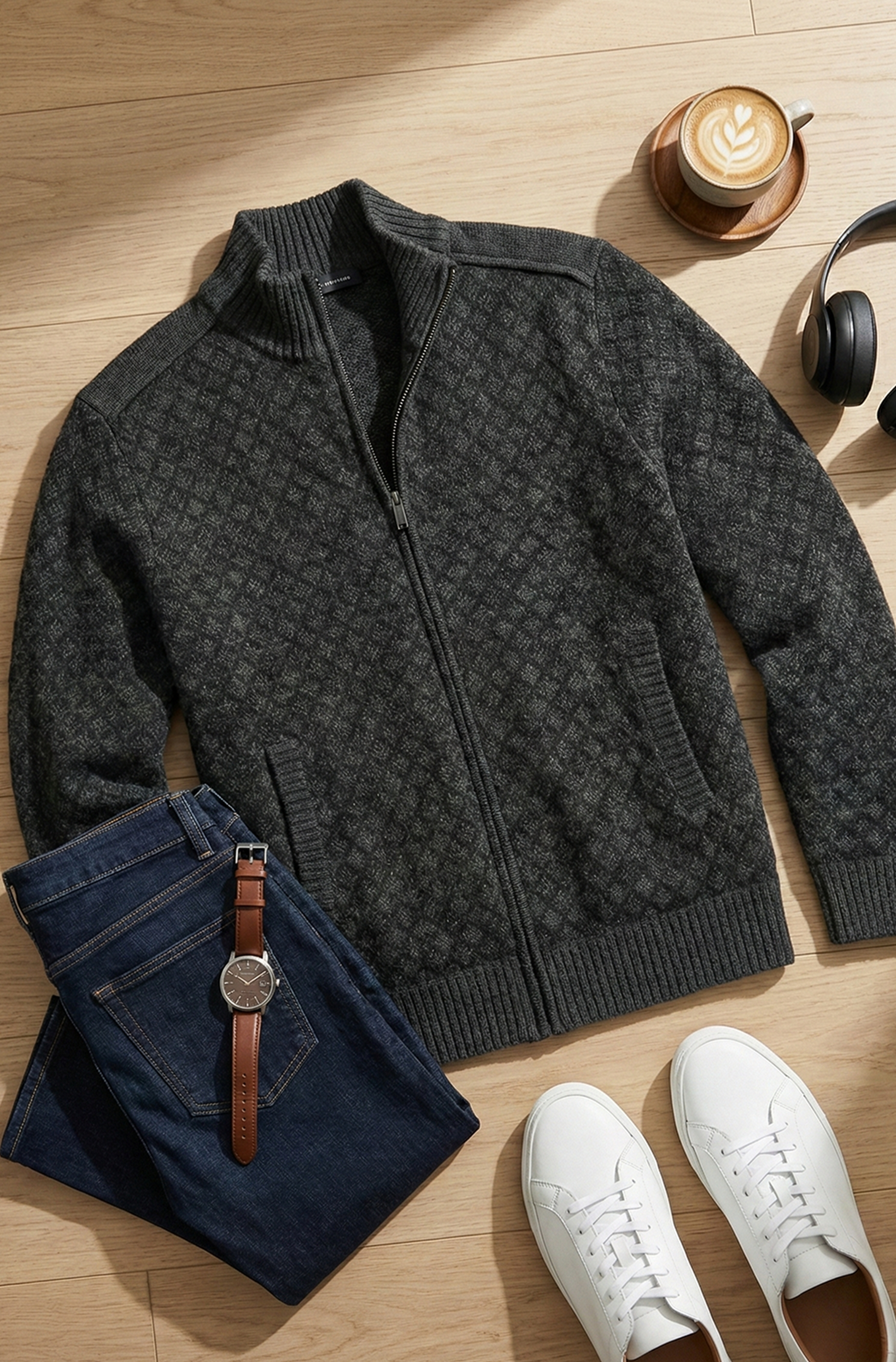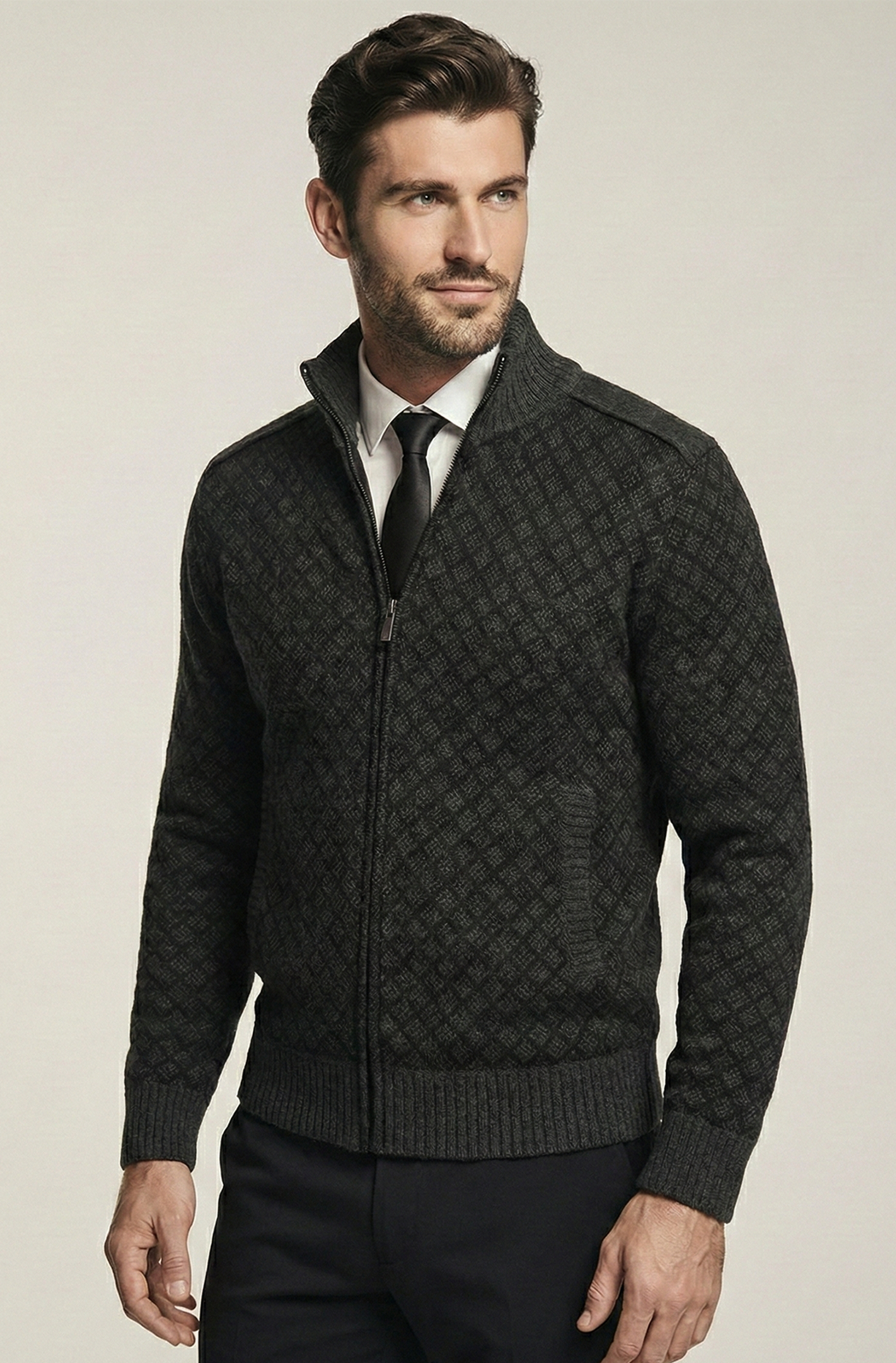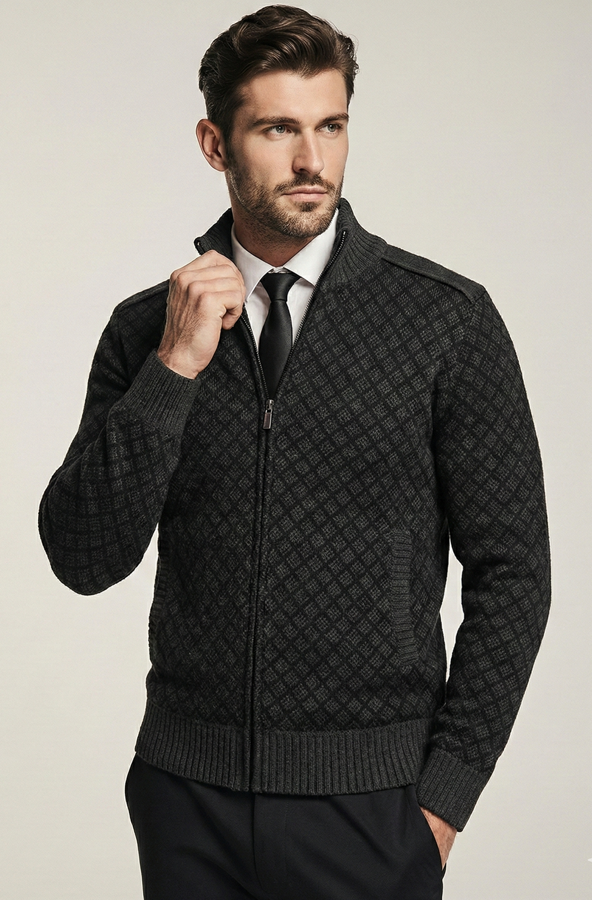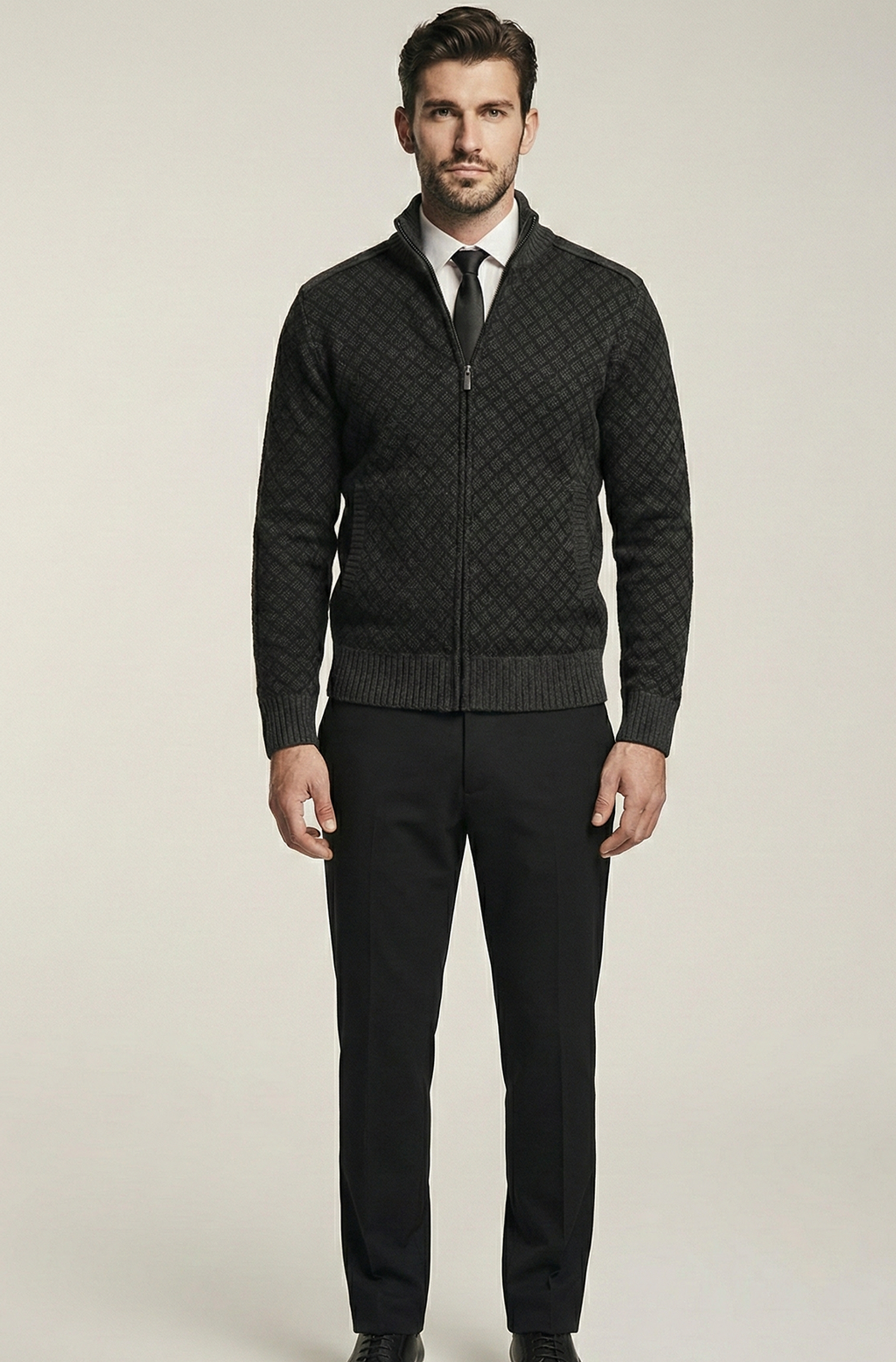 En tidlös och mångsidig stickad jacka i klassiskt svart, perfekt för dig som vill ha ett stilrent plagg som passar alla tillfällen. Det geometriska diamantmönstret ger en diskret men exklusiv struktur, medan den höga kragen och dragkedjan i full längd kombinerar komfort med funktionalitet. “Johan” i svart är ett självklart val för en modern garderob—elegant, ren och alltid rätt.