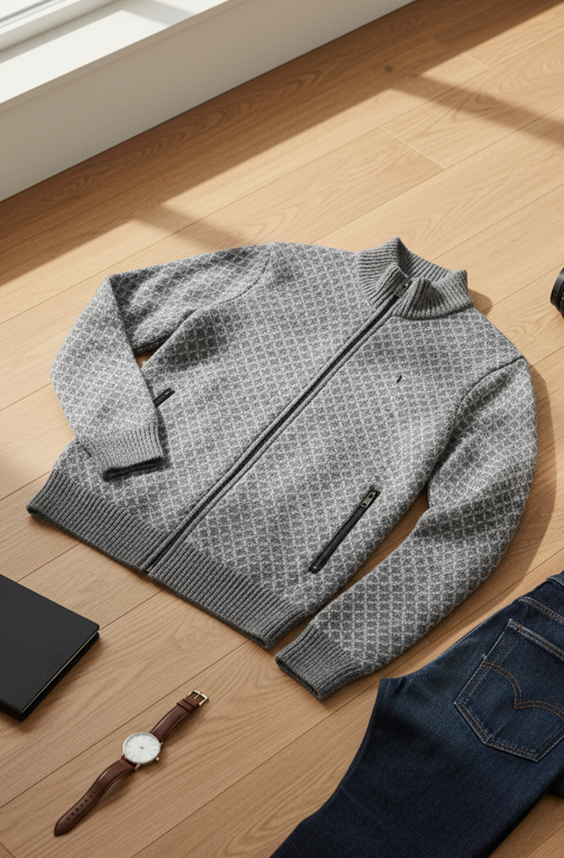 En stilren och modern stickad jacka skapad för mångsidig användning året runt. Den mjuka grå tonen kompletteras av ett diskret geometriskt diamantmönster som ger plagget en tydlig skandinavisk känsla. Med hög krage och en smidig dragkedja framtill erbjuder den både komfort och elegant enkelhet—perfekt som lager i alla säsonger. “Lennart” står för tidlös design med praktiska detaljer som passar varje garderob.